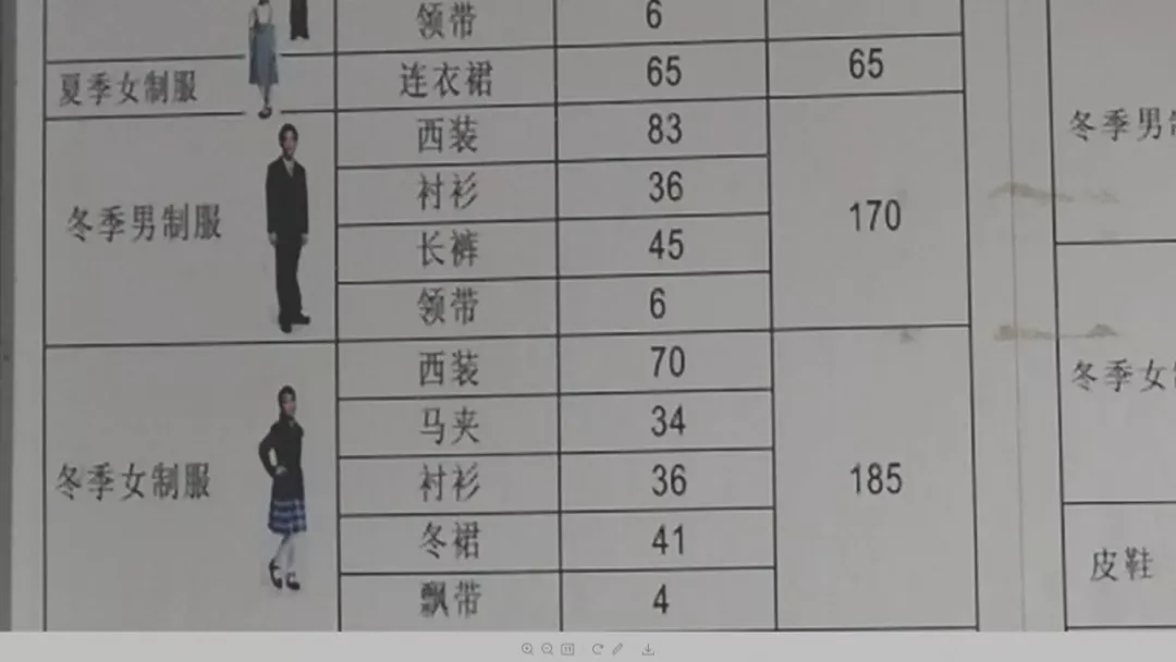 而中學學生男女冬季制服價格為170和185元。