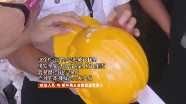 在這家“榮昌隆建材五金批發(fā)店”,擺放著多種顏色的安全帽。而執(zhí)法人員檢查發(fā)現(xiàn),其中有一款懷疑為“三無(wú)”產(chǎn)品。