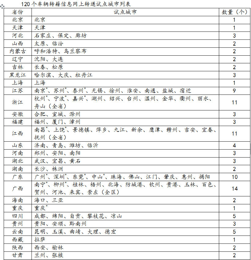 4.?dāng)U大車輛轉(zhuǎn)籍信息網(wǎng)上轉(zhuǎn)遞試點(diǎn)。在原有15個(gè)試點(diǎn)城市的基礎(chǔ)上,進(jìn)一步擴(kuò)大非營(yíng)運(yùn)小微型載客汽車檔案電子化網(wǎng)上轉(zhuǎn)遞試點(diǎn),在直轄市、省會(huì)市、自治區(qū)首府市、計(jì)劃單列市全部推行,同時(shí)各?。▍^(qū))至少再選擇1至2個(gè)城市推行。對(duì)機(jī)動(dòng)車在試點(diǎn)城市之間轉(zhuǎn)籍的,申請(qǐng)人可以直接到車輛遷入地車輛管理所申請(qǐng)并辦理,無(wú)需再回遷出地驗(yàn)車、提取紙質(zhì)檔案。