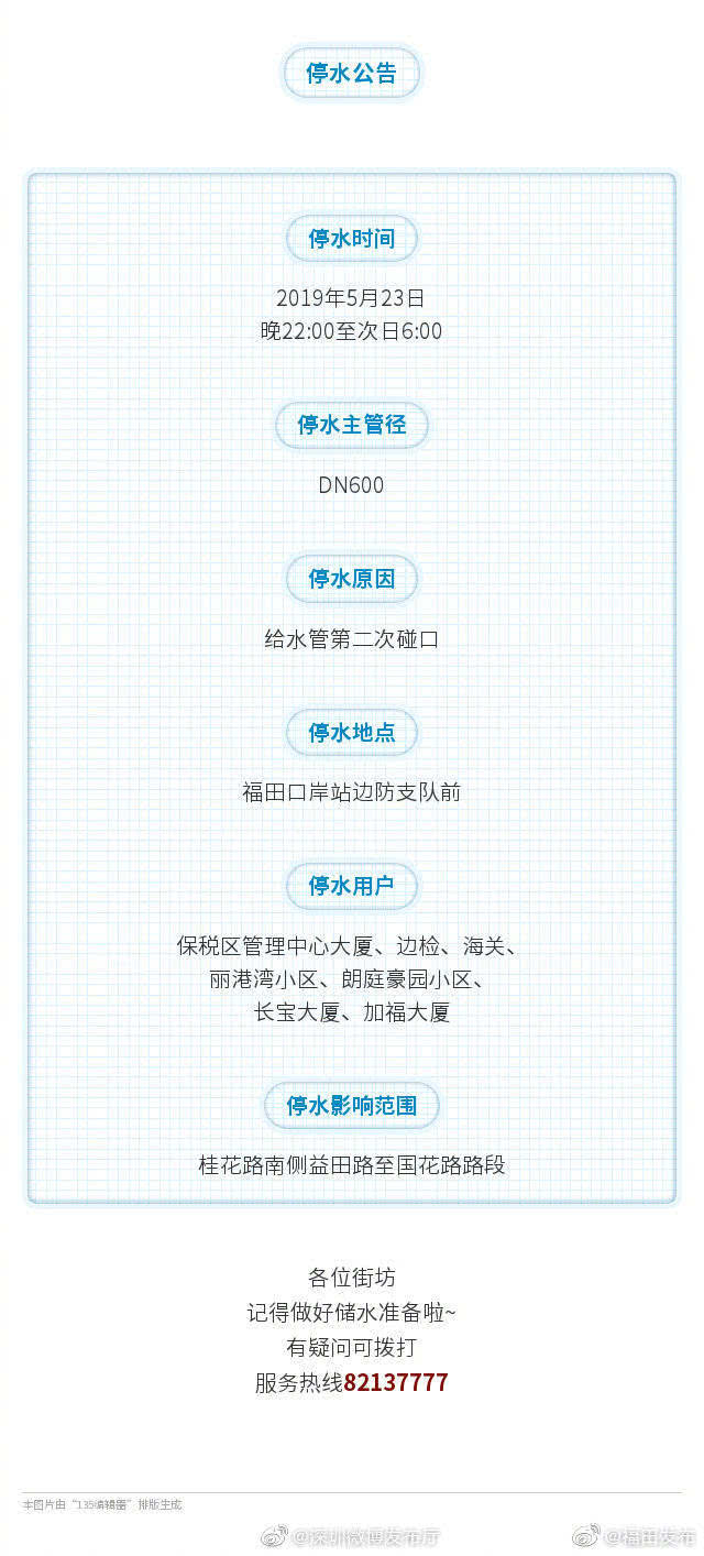 溫馨提醒!今天晚上22:00至明日6:00,福田區(qū)保稅區(qū)管理中心大廈、邊檢、海關(guān)、麗港灣小區(qū)、朗庭豪園小區(qū)、長寶大廈、加福大廈等區(qū)域?qū)⒂媱澩K魑唤址挥浀米龊脙λ疁蕚浒?!戳下圖了解更多停水停電資訊!