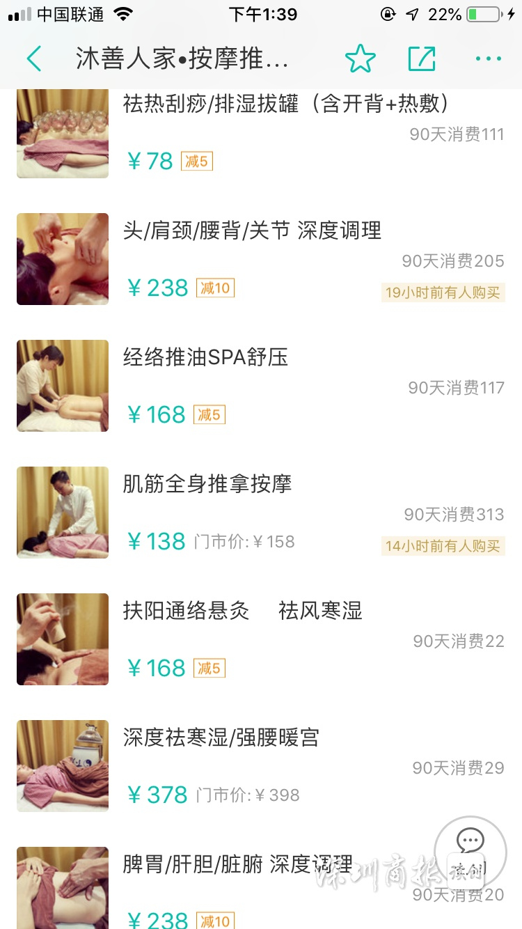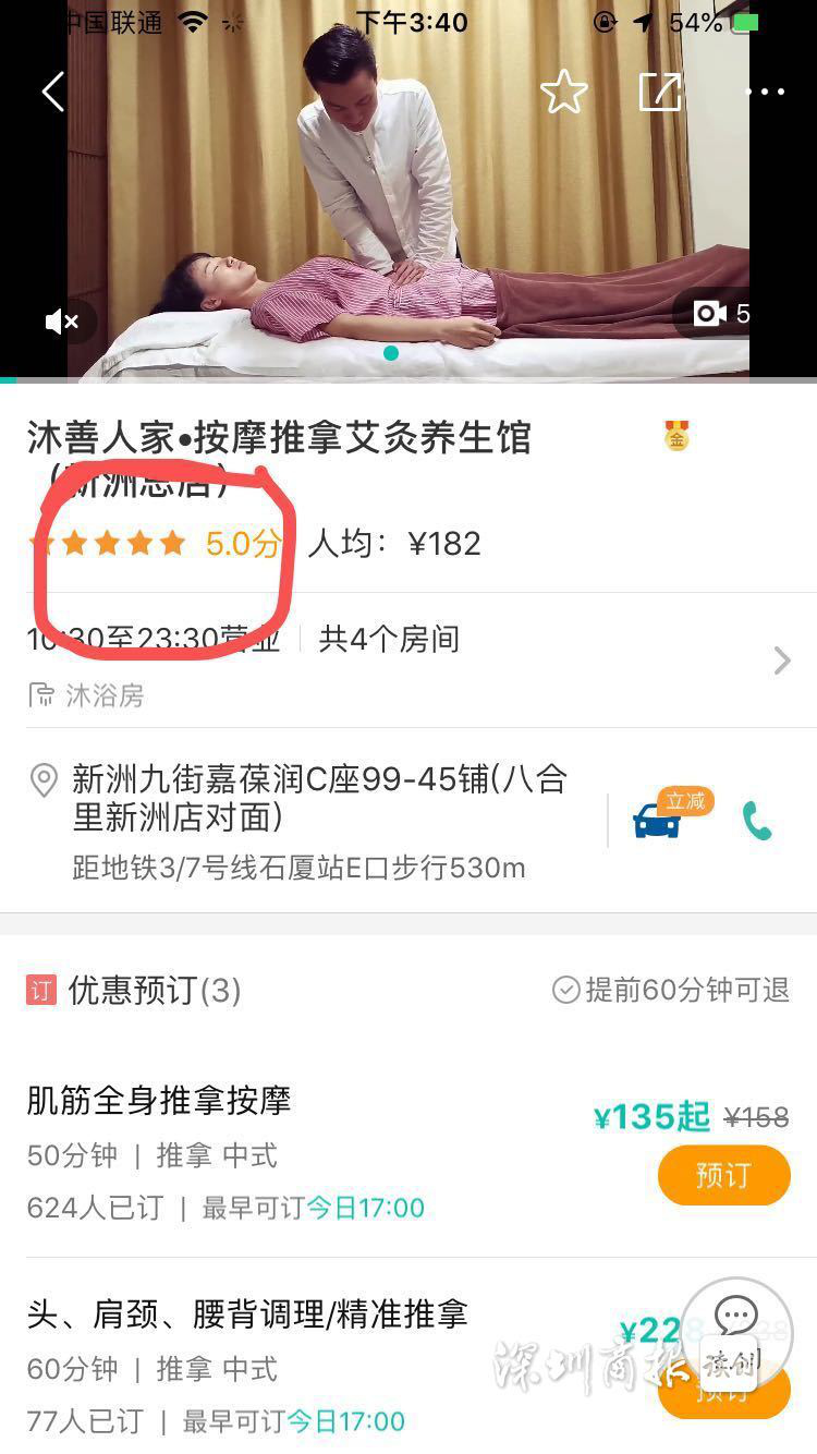 5月16日,55歲的劉女士通過美團點評查詢,發(fā)現(xiàn)一家五星"足療按摩人氣商戶"。下午3時許,劉女士來到深圳市福田區(qū)沐善人家按摩艾灸養(yǎng)生館新洲店進行按摩。