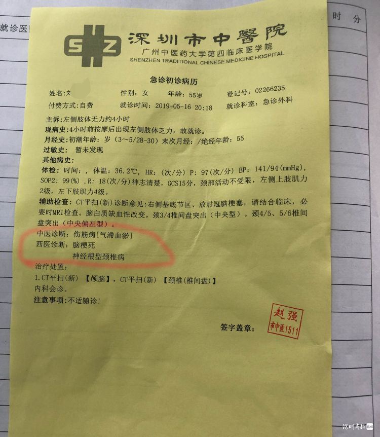 劉女士感到身體不適后要求送醫(yī)檢查,店家則找來里其他"師傅",繼續(xù)進行3個多小時的按摩、艾灸……"耽誤了我母親的最佳搶救時間。后來是我到了,強烈要求送醫(yī)院,他們才帶著我母親去中醫(yī)院就診,診斷是急性腦梗死。"劉女士女兒李小姐告訴記者,店家在發(fā)生3小時后才將其母親目前送醫(yī)院救治,醫(yī)生告訴她錯過了最佳救治時間。