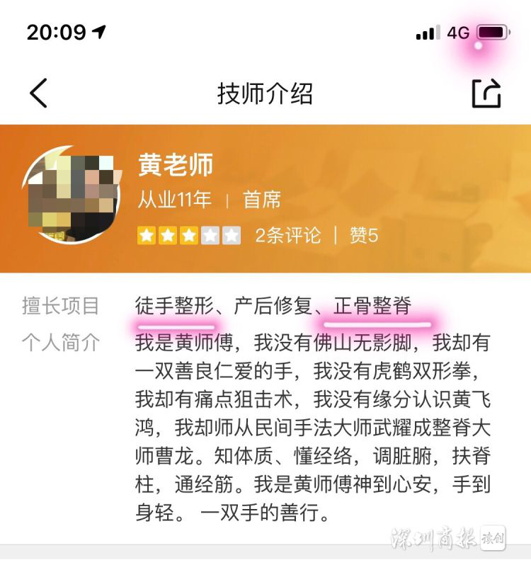 涉事黃師傅在美團上介紹顯示為首席技師,其從業(yè)11年,擅長項目為徒手整形、產(chǎn)后修復、正骨整脊。值得注意的是,該店在美團上評價為五星滿分。