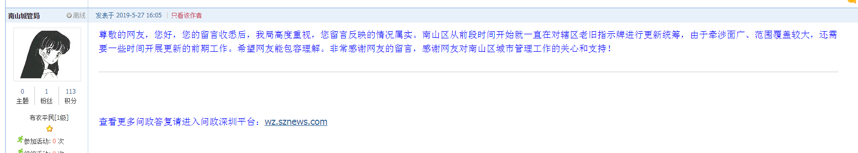 為及時解決網(wǎng)友疑問,5月27日下午,南山城管局在網(wǎng)友“syh19667288”發(fā)布的帖文下給予回復(fù)稱需要時間來開展更新工作。具體回復(fù)如下: