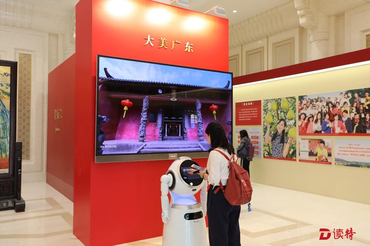 新中國成立70周年廣東省成果展入口處克魯澤提供智能迎賓服務(wù)。