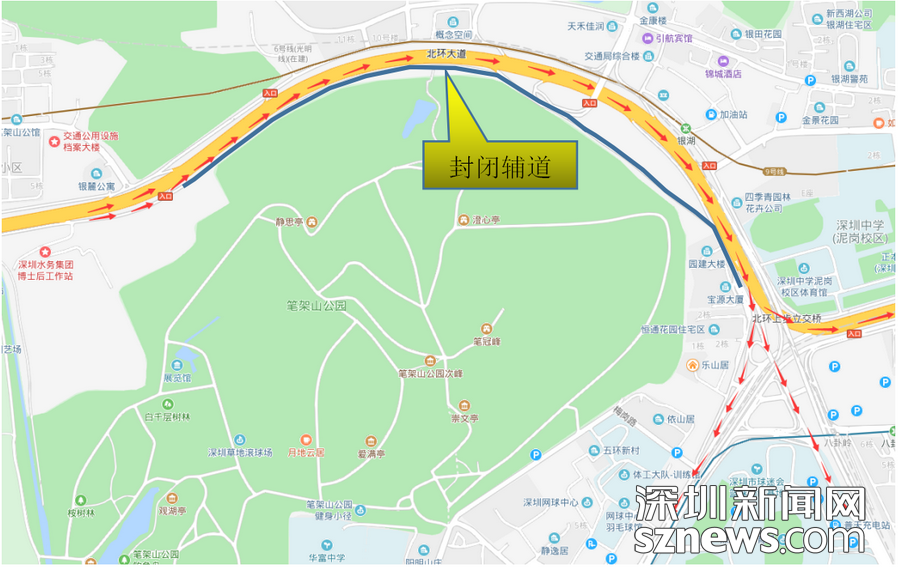 夜間封閉北環(huán)大道主道時(shí),主道車輛合流至輔道2車道直行至上步北路經(jīng)羅湖、鹽田右轉(zhuǎn)出口匝道后往泥崗西路東行或擇周邊其他道路通行;而夜間封閉北環(huán)大道輔道時(shí),輔道車輛合流至主道3車道直行至上步立交處右轉(zhuǎn)輔道臨時(shí)出口,車輛可選擇臨時(shí)開設(shè)出口或周邊其他道路通行。