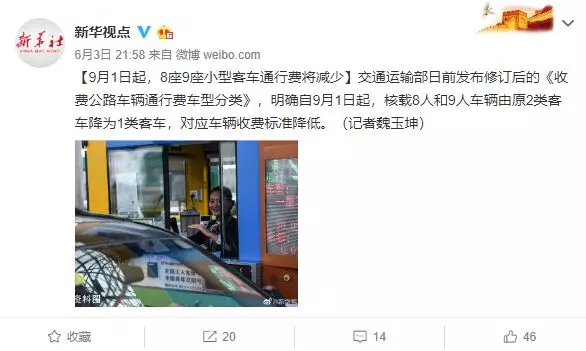 核載8人和9人車輛由原2類客車降為1類客車,降低了對應(yīng)車輛的收費(fèi)標(biāo)準(zhǔn)