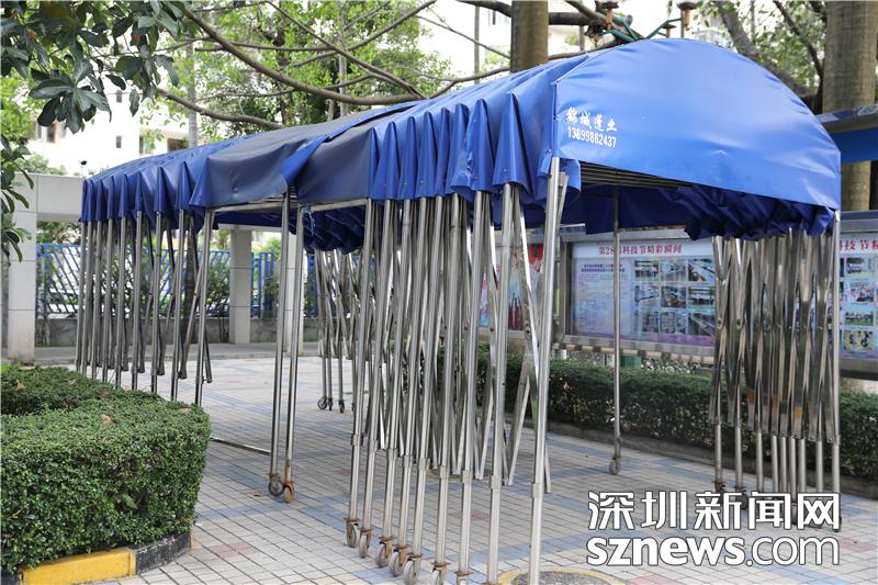深圳實驗中學中學部考點配置了陰雨連廊,為下雨天氣做準備