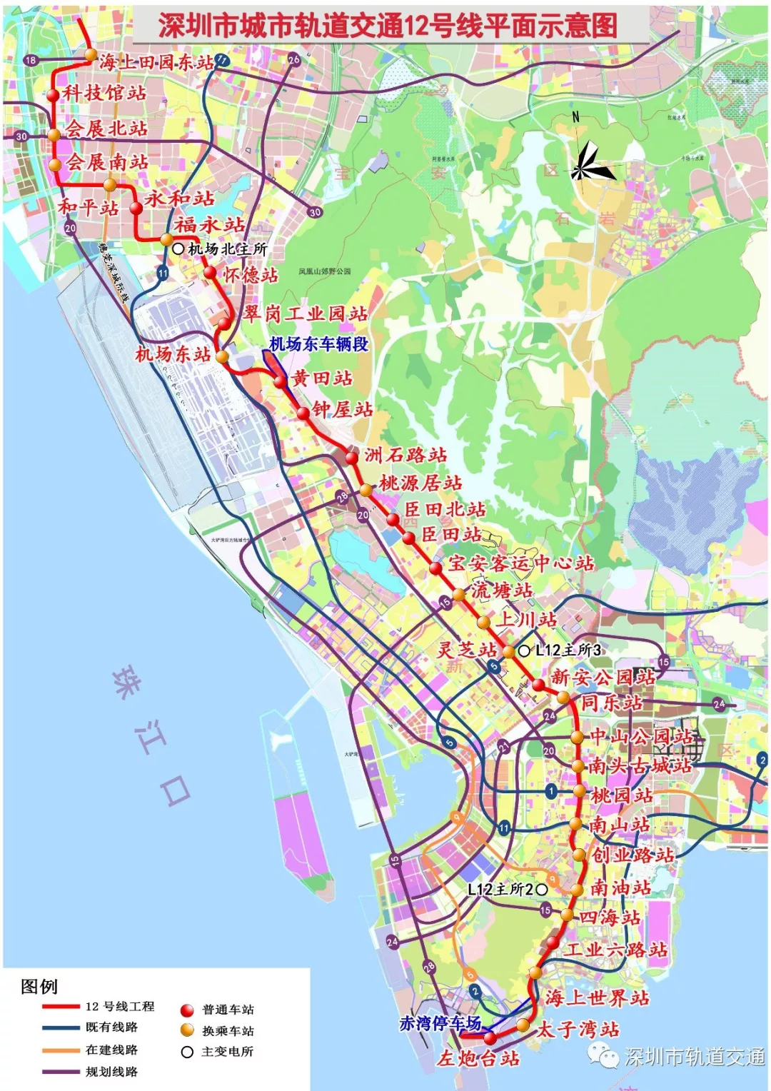 深圳地鐵12號(hào)線線路起自左炮臺(tái)站,終至海上田園東站;線路全長(zhǎng)約40.54km,全線采用地下敷設(shè)方式;共設(shè)站33座,其中換乘站18座。