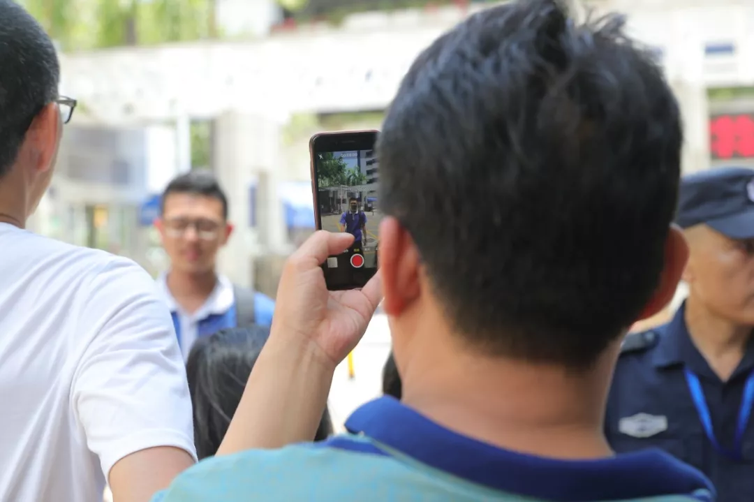△考場外焦急等待的考生家長紛紛拿出手機準(zhǔn)備拍攝邁出考場的孩子。