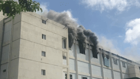 濃煙從廠房的頂層窗戶冒出