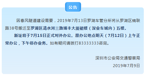 公告 因春風隧道建設需要,2019年7月13日羅湖車管分所將從羅湖區(qū)錦聯(lián)路38號搬遷至羅湖區(qū)清水河三路博豐大廈裙樓(深業(yè)車城內(nèi))五樓。_ _ _ _ _ 羅湖分所新址采用全開放式的業(yè)務辦理窗口,并配套了多種自助辦理設備,為群眾構建更加便捷高效、自主貼心的辦事環(huán)境。