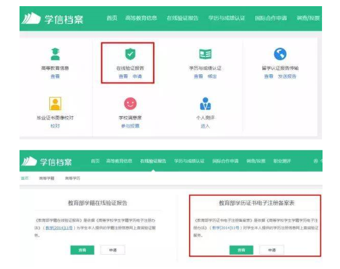 登錄之后,點(diǎn)擊“申請(qǐng)?jiān)诰€驗(yàn)證報(bào)告”,選擇查看《教育部學(xué)歷證書電子注冊(cè)備案表》。