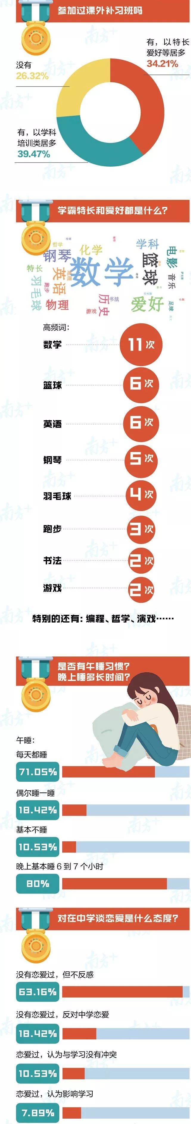 不論學習再緊張,80%的“牛娃”還是基本保證了6-7小時的晚間睡眠,還有超過70%的“牛娃”堅持午睡,為下午的學習充充電。