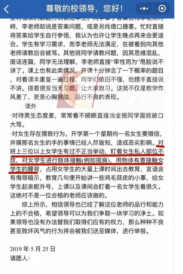 李先生向記者提供了一份,據(jù)稱是學(xué)生寫的聯(lián)名信,關(guān)于這位老師的不當(dāng)品行,其中寫道“對班上三位以上女學(xué)生有過不正當(dāng)舉動,盯著女生私人部位不放,對女學(xué)生進(jìn)行肢體接觸,例如攬肩,用物體有意接觸女學(xué)生的腰背,給女生起親昵外號”。