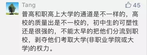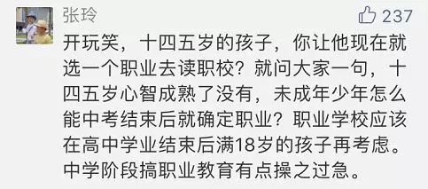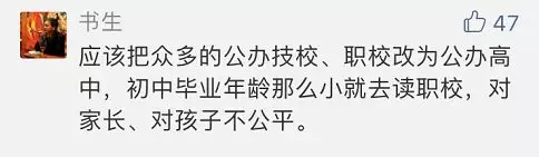 有網(wǎng)友表示:十四五歲的孩子行知尚未成熟,未成年少年無(wú)法在中考結(jié)束后就確定職業(yè),職業(yè)學(xué)校應(yīng)該在高中學(xué)業(yè)結(jié)束后滿18歲的孩子再考慮。中學(xué)階段搞職業(yè)教育有點(diǎn)操之過(guò)急。