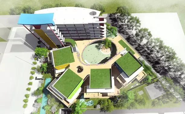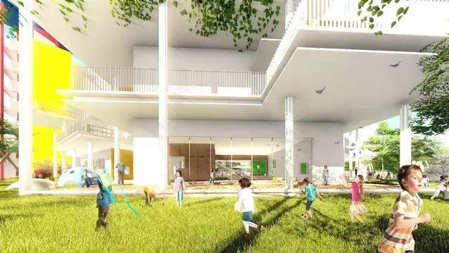 室外環(huán)境設(shè)有滿足孩子們的橡膠跑道、人工草坪,大型娛樂滑梯設(shè)施等等,各層也設(shè)置了公共平臺(tái),為幼兒提供多樣化的樂趣,滿足幼兒好奇、好動(dòng)、好模仿的特點(diǎn)。在屋頂設(shè)置了綠植與小型趣味玩具區(qū),讓幼兒接觸自然,喜歡自然。