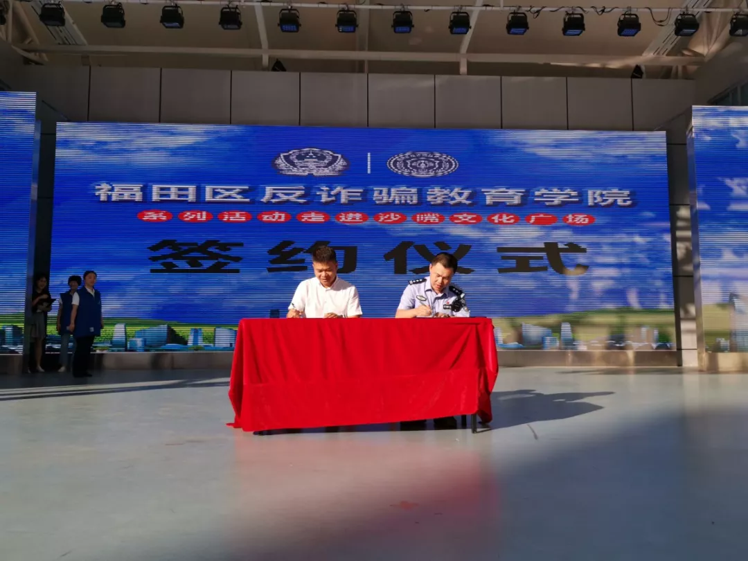 活動現(xiàn)場,肖劍平所長與沙頭街道辦黨工委副書記熊新清及沙嘴實業(yè)股份有限公司簽署了《福田反詐騙教育??窇?zhàn)略合作協(xié)議。