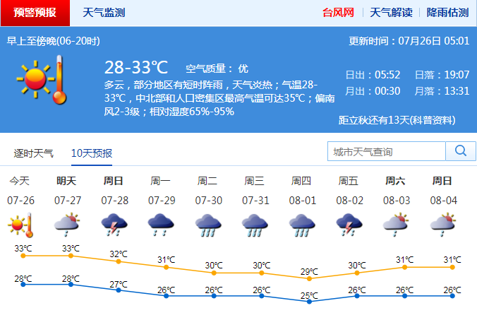 記者從市氣象臺獲悉,受副熱帶高壓影響,26日多云,局部有短時陣雨,氣溫28~33 ℃,局部最高35 ℃;27日多云,部分地區(qū)有短時陣雨或雷雨,天氣炎熱;28日有雷陣雨,伴有短時強(qiáng)降水和6~8級短時大風(fēng);29日有雷陣雨,局部大雨;30~31日有一次明顯降雨過程。