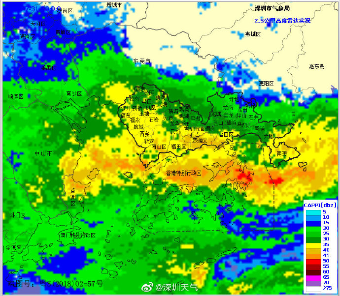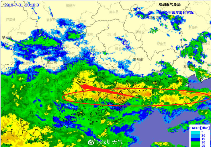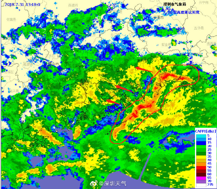 當(dāng)一條雨帶的長軸和雨帶的移動方向(箭頭)夾角很小時,某個地方就會被這條雨帶幾乎從頭到尾地經(jīng)過,于是這個地方的累計雨量就會特別大。而現(xiàn)在深圳靠南的大部分區(qū)域就在經(jīng)歷一場列車效應(yīng),所以這場雨持續(xù)時間比較長,短時間內(nèi)停不下來。