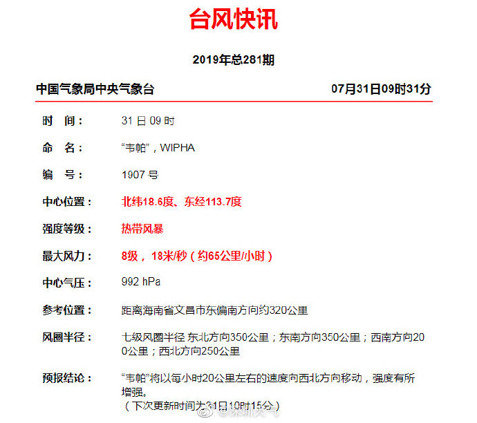 截至7月31日22時,臺風(fēng)“韋帕”(熱帶風(fēng)暴級)中心位于廣東省徐聞市東偏南方向約220公里的南海西北部海面上,中心附近最大風(fēng)力9級,達(dá)到每秒23米的風(fēng)速,六級大風(fēng)半徑范圍約480公里。