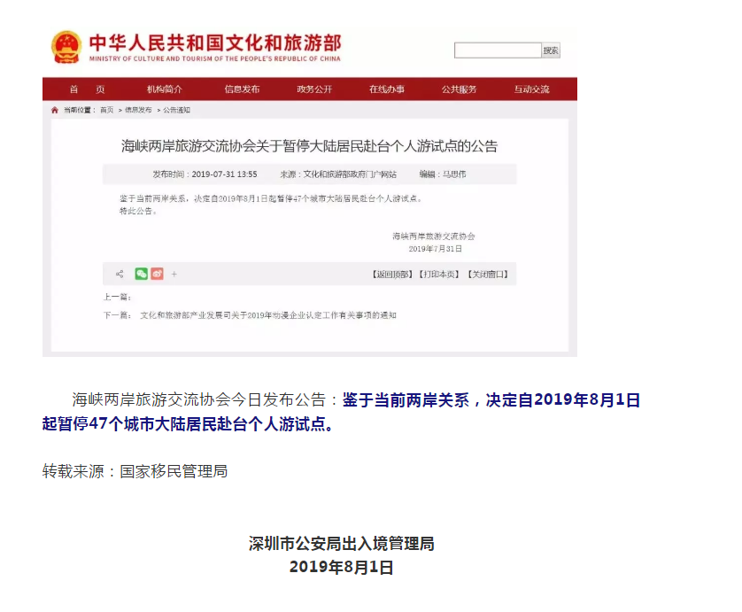 8月1日,暫停47個(gè)城市大陸居民赴臺(tái)個(gè)人游試點(diǎn)