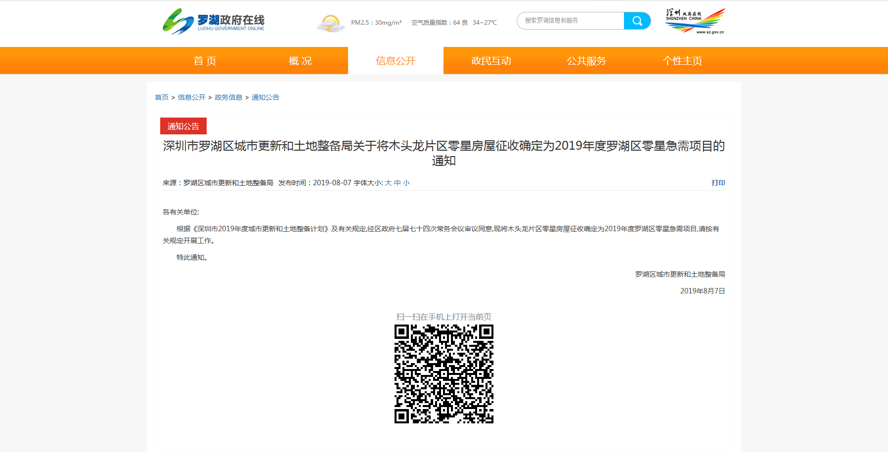 “經(jīng)過(guò)全面分析,木頭龍項(xiàng)目涉及眾多公共利益、現(xiàn)狀存在重大社會(huì)風(fēng)險(xiǎn)的情況下,根據(jù)《深圳市2019年度城市更新和土地整備計(jì)劃》房屋征收專項(xiàng)計(jì)劃中明確的‘考慮到各區(qū)公共利益項(xiàng)目的急需,各區(qū)區(qū)級(jí)房屋征收計(jì)劃可安排零星急需項(xiàng)目1項(xiàng)’,羅湖區(qū)政府將木頭龍片區(qū)零星房屋征收確定為2019年度羅湖區(qū)零星急需項(xiàng)目,并啟動(dòng)征收程序,盡快破解重大歷史遺留難題,防范和化解重大風(fēng)險(xiǎn),落實(shí)項(xiàng)目配套的交通設(shè)施、保障性住房等急需公共利益?!彼f(shuō),政府將依法依規(guī)實(shí)施房屋征收并進(jìn)行征收補(bǔ)償,保障被征收人的合法權(quán)益。