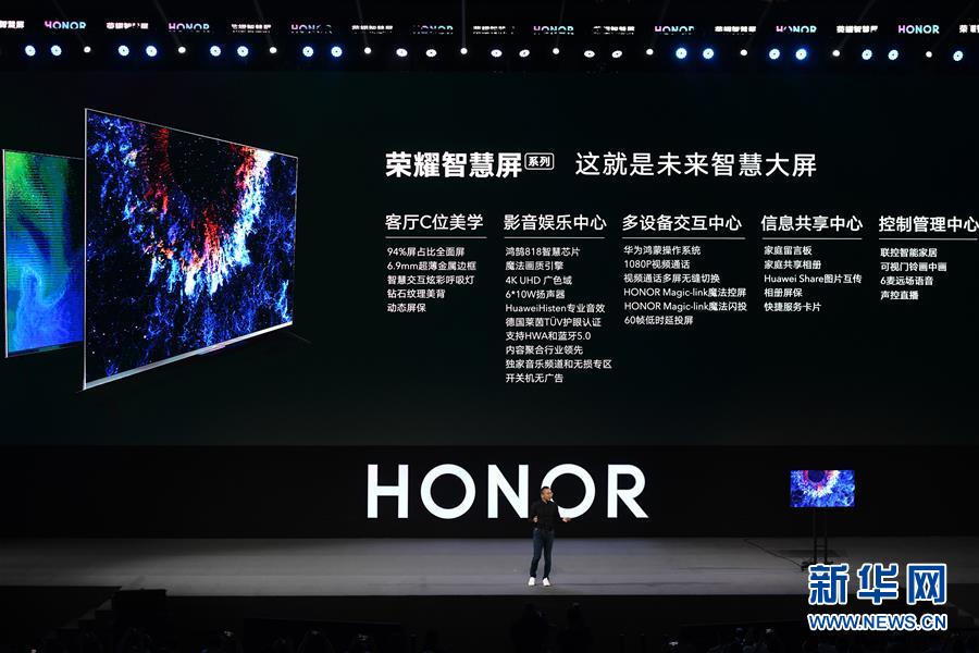 8月10日,華為榮耀總裁趙明在發(fā)布會(huì)上介紹榮耀智慧屏。新華社記者 梁旭 攝