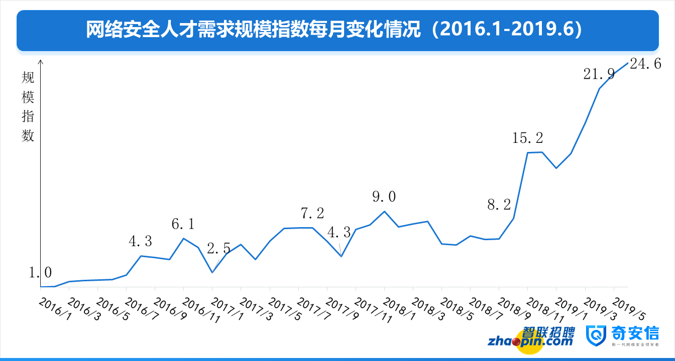 根據(jù)智聯(lián)招聘網(wǎng)絡(luò)安全人才大數(shù)據(jù)顯示,2019年6月網(wǎng)絡(luò)安全人才市場需求的規(guī)模達到2016年1月需求的24.6倍,相比2018年7月也增長了3倍,增長速度堪稱驚人!