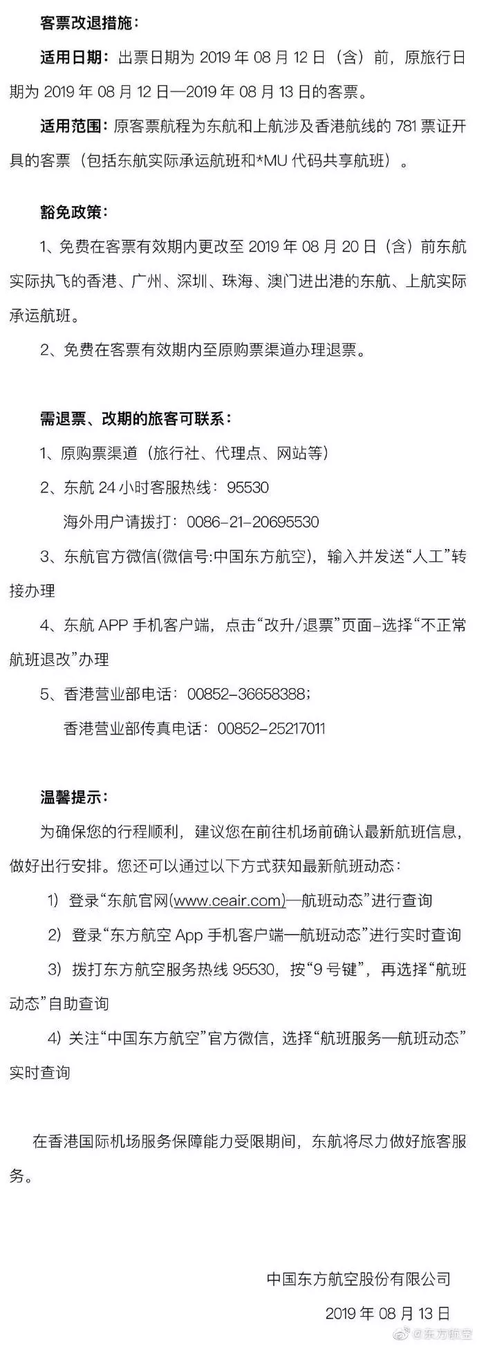 今晨,東方航空官方微博發(fā)布通告稱,受香港國際機場服務保障能力限制持續(xù)影響,東航繼續(xù)取消8月13日期間部分香港進出港航班10班,后續(xù)東航將根據(jù)香港國際機場運行保障情況,動態(tài)調(diào)整航班。目前取消航班信息如下圖: