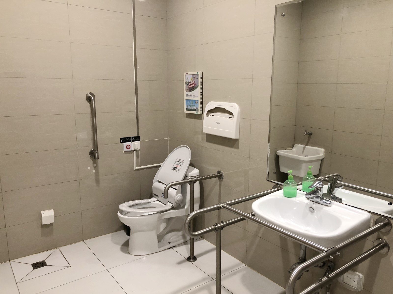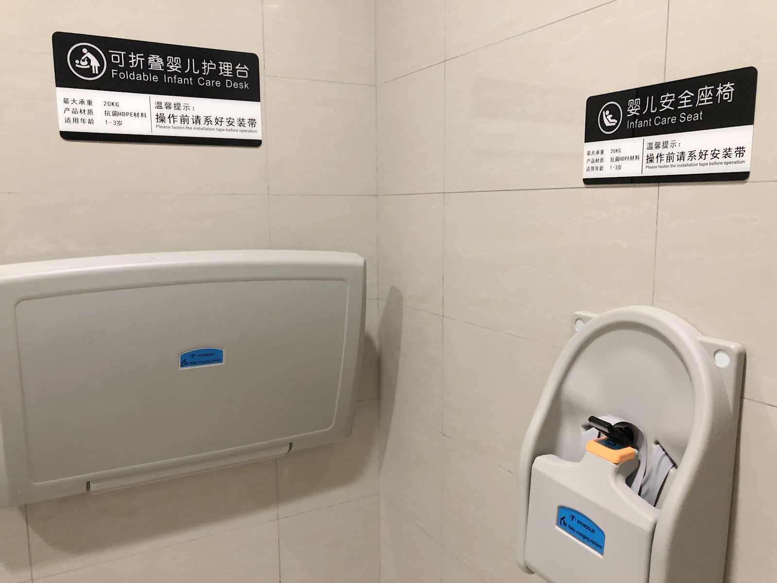 ▲在靠近福田高鐵站方向的另一處洗手間,記者在殘疾人洗手間的門上看到了第三衛(wèi)生間圖案標(biāo)識(shí)。推門進(jìn)入,里面除了設(shè)有帶扶手、供殘疾人使用的成人坐便器和洗手池之外,還有可折疊的嬰兒護(hù)理臺(tái)和嬰兒安全座椅,這顯然是一間將母嬰室、殘疾人洗手間“二合一”的洗手間,但沒(méi)有第三方洗手間配置所要求的兒童坐便器。