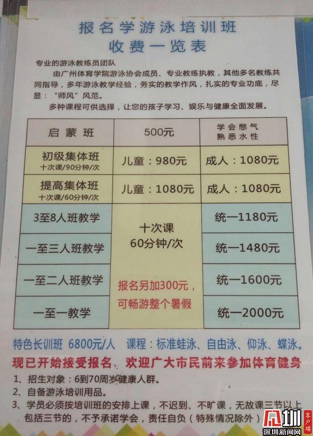 記者采訪獲悉,龍崗區(qū)華南城附近某游泳培訓(xùn)班,已推出了游泳中考滿分班項(xiàng)目,價(jià)格為28000元,三年內(nèi)可無限次數(shù)上課;對中考體育游泳科目分?jǐn)?shù)要求在80分的,價(jià)格為20000元,課時(shí)不限。