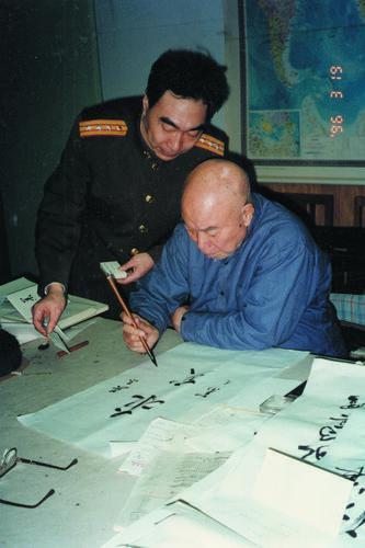 ▲1996年軍旅作家吳東峰(左)到開國上將肖克(右)家中采訪時,蕭克將軍在他墨香陣陣的書房內給他寫下‘求實’兩個大字。