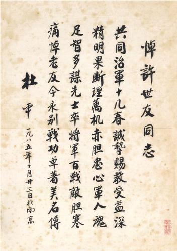 在采訪一位又一位身經百戰(zhàn)的幸存者時,吳東峰與他們的筆墨緣也就此結下?!?985年許世友將軍因病逝世,杜平將軍親手書寫‘悼許世友同志’詩一首,請我送《人民日報》刊登,我把詩傳真過去,原件保存下來了。這首詩見證了杜平與許世友的深厚友情,是我最早的將軍墨跡手藏。那之后,我開始有意識地收集將軍們的筆墨。”