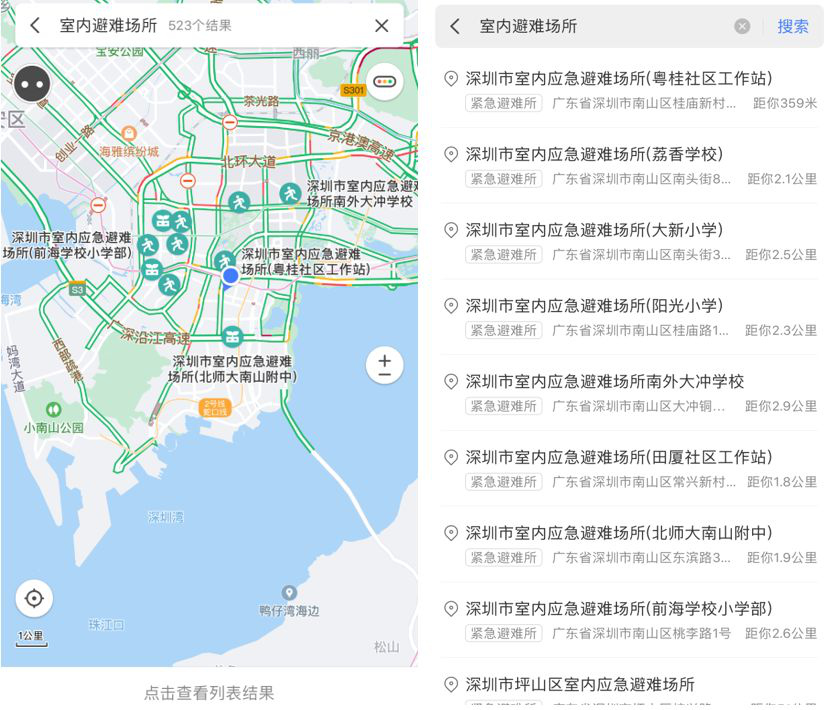 近日,深圳市室內應急避難場所查詢和導航功能在騰訊地圖上線試運行,大家在"深圳應急管理"官方微信公眾號菜單欄"服務互動"-"應急避險"欄目,或在騰訊地圖 APP、"騰訊地圖 +"微信小程序搜索"室內應急避難場所",便可獲取附近所有應急避難場所的位置名稱、地址、緊急聯(lián)系電話等信息: