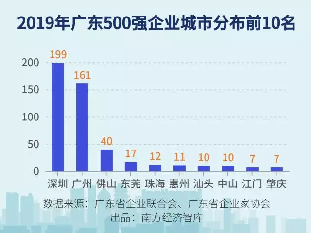 在這份榜單中,500家入選企業(yè)分布于廣東19個(gè)城市。其中,超過(guò)九成來(lái)自珠三角城市,前10強(qiáng)企業(yè)來(lái)自廣州、深圳、佛山三市,2018年?duì)I業(yè)收入超過(guò)1千億的21家企業(yè)同樣來(lái)自珠三角,其中深圳11家,廣州6家,佛山2家,珠海和惠州各有1家。