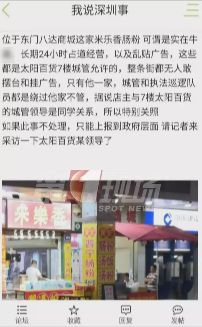 昨天,論壇上的一則帖子引起網(wǎng)友圍觀,帖子提到位于東門(mén)八達(dá)商城的米樂(lè)腸粉店,24小時(shí)占道經(jīng)營(yíng),亂貼廣告。整條街都不敢這么做,唯獨(dú)這家沒(méi)有城管管理,原因是店主跟7樓太陽(yáng)百貨的城管領(lǐng)導(dǎo)是同學(xué)。