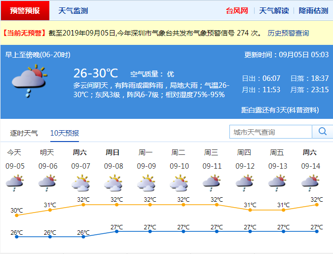 見圳客戶端、深圳新聞網(wǎng)2019年9月5日訊 今年14號臺風“劍魚”(熱帶風暴級)3日17時減弱為熱帶低壓后,其風力進一步減弱,已難以確定其環(huán)流中心,中央氣象臺于4日2時停止對其編號。市氣象臺于4日8時30分取消臺風白色預警信號。盡管如此,受“劍魚”減弱后低壓槽影響,今日我市有大雨局部暴雨,沿海、海區(qū)和高地陣風6-7級;6日降雨減弱;7日起轉多云,有短時陣雨,天氣炎熱。