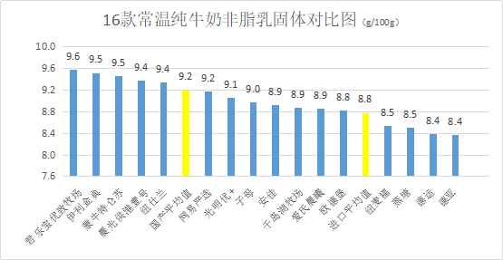 測評結(jié)果顯示:君樂寶優(yōu)質(zhì)牧場、伊利金典、蒙牛特侖蘇非脂乳固體含量排前三,8款國產(chǎn)牛奶非脂乳固體平均值9.2g/100g,8款進口牛奶非脂乳固體平均值8.8g/100g,均高于國標(biāo)要求,國產(chǎn)牛奶表現(xiàn)優(yōu)于進口牛奶。