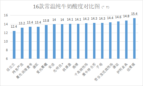 8款國產(chǎn)牛奶酸度在13~15°T之間。8款進口牛奶中紐麥福全脂純牛奶的酸度15.4°T,紐仕蘭牧場全脂牛奶酸度12.4,其它6款也是13~15°T之間。其中,紐仕蘭、網(wǎng)易嚴(yán)選、晨光供港壹號、德亞酸度較低,表明新鮮度和熱穩(wěn)定性較好。