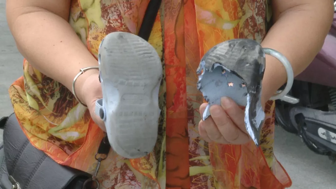而除了洞洞鞋之外,我們欄目也曾報道過穿拖鞋乘梯造成的類似危險情況。