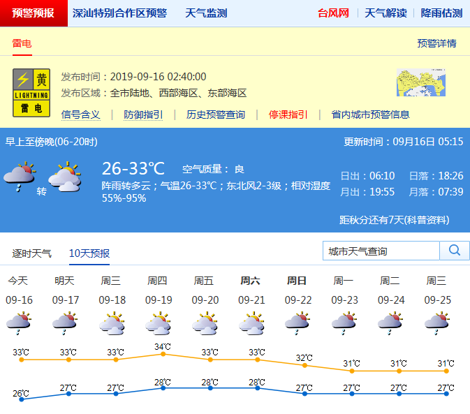 見圳客戶端·深圳新聞網(wǎng)2019年9月16日訊 深圳市氣象臺預(yù)計,周一我市多云,有短時(雷)陣雨,部分時間雨勢稍大,氣溫26-33℃;周二至周日多云到晴天,天氣趨于悶熱,午后局地有短時陣雨。