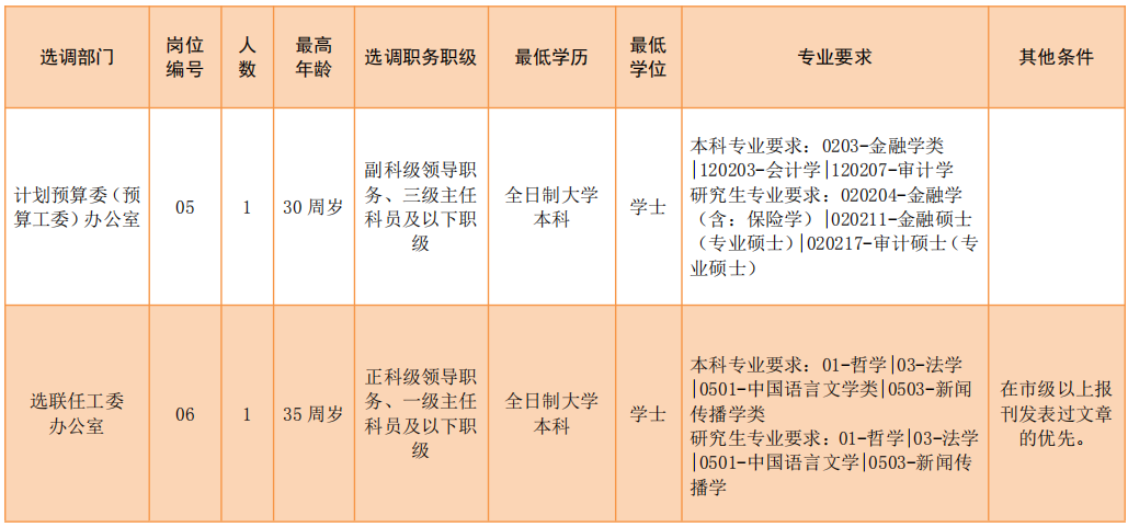 選調(diào)條件要求具有3年以上公務(wù)員工作經(jīng)歷(含試用期),已進(jìn)行公務(wù)員登記,且歷年公務(wù)員年度考核為稱職及以上等次。全日制普通高校大學(xué)本科以上學(xué)歷,學(xué)士以上學(xué)位。副科級(jí)領(lǐng)導(dǎo)職務(wù)、三級(jí)和四級(jí)主任科員、一級(jí)科員年齡在30周歲以下(1988年9月30日以后出生),正科級(jí)領(lǐng)導(dǎo)職務(wù)、一級(jí)和二級(jí)主任科員年齡在35周歲以下(1983年9月30日以后出生)等。