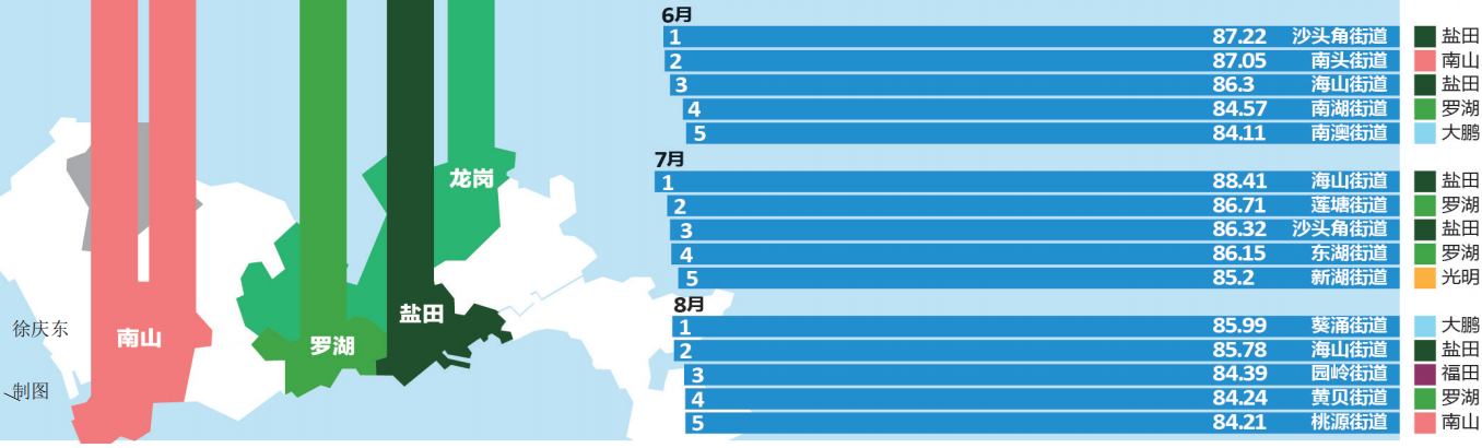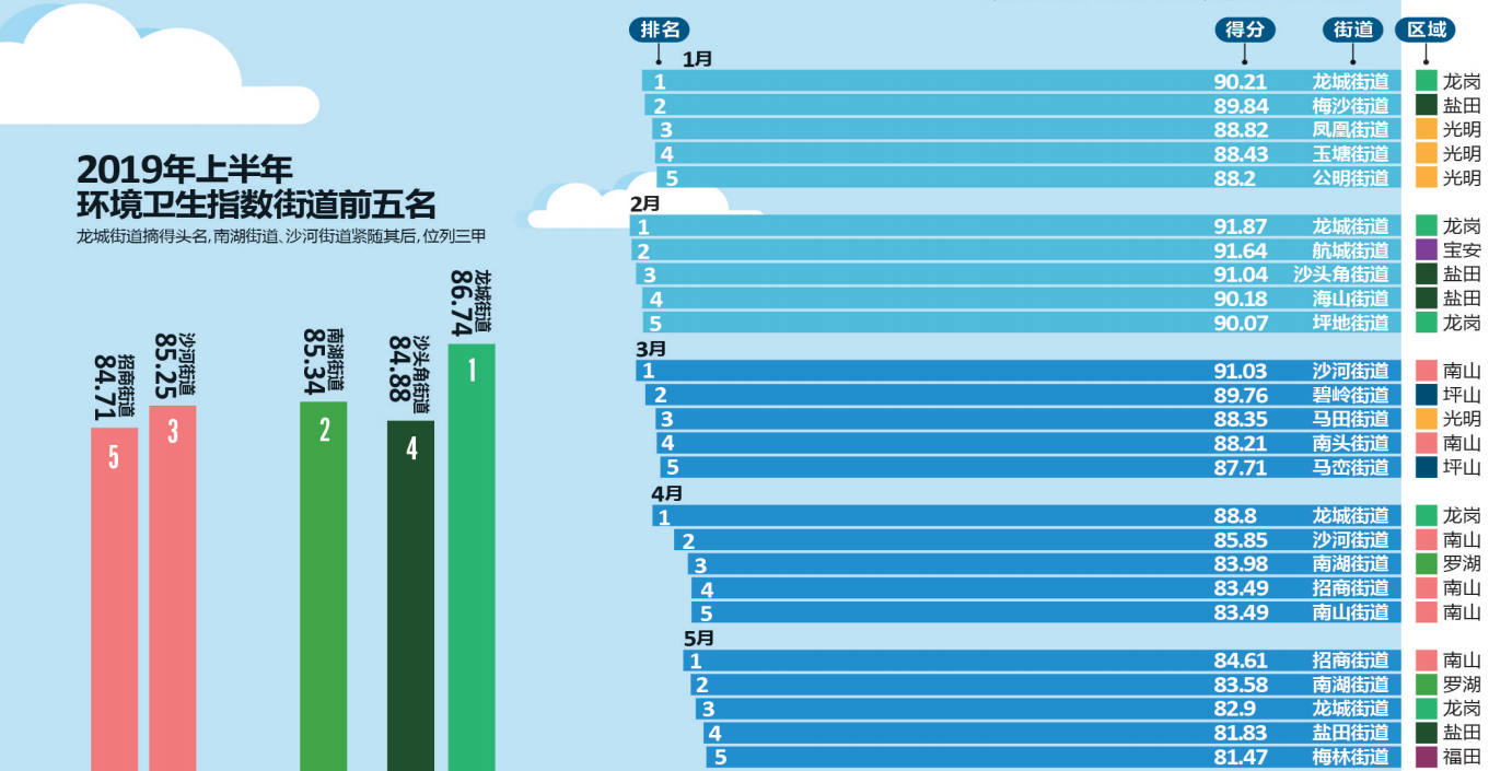 推進環(huán)境質(zhì)量邁進國際一流,深圳一直在行動。細心的市民可能早已發(fā)現(xiàn),深圳市城市管理和綜合執(zhí)法局官方網(wǎng)站每個月都會發(fā)布“深圳市環(huán)境衛(wèi)生指數(shù)排行榜”,為深圳的環(huán)境衛(wèi)生“打分”。據(jù)了解,深圳市環(huán)境衛(wèi)生指數(shù)測評排名已連續(xù)開展了兩年半,有效促進了全市環(huán)境衛(wèi)生的提升和轉(zhuǎn)變。今年上半年的“成績單”顯示,全市各區(qū)(新區(qū))各街道你追我趕,測評工作帶動社區(qū)環(huán)境改善,環(huán)境衛(wèi)生的整治提升得到了市民的廣泛認可和好評。