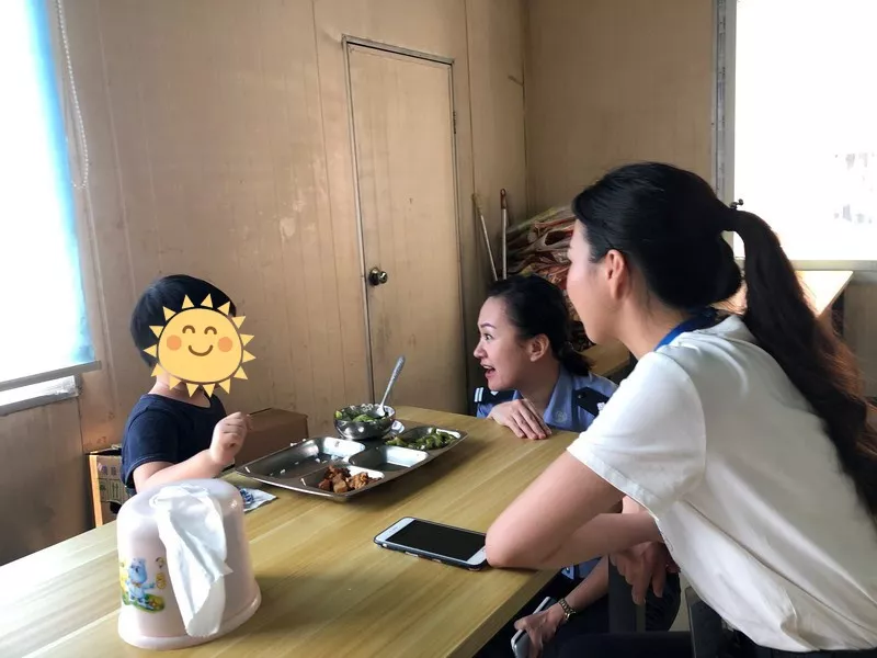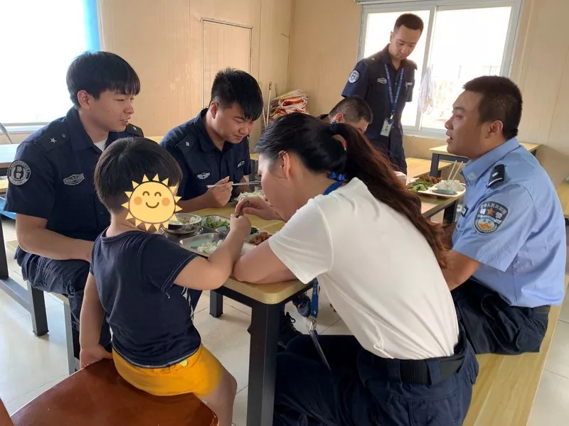正值午飯時分,小男孩說餓了,想吃肉。郭飛教導員立即到飯?zhí)媒淮鷰煾堤酎c嫩的青菜,做點軟一些的肉給小男孩吃。并安排輔警王野、輔助人員黃以敏等人繼續(xù)陪同就餐和安撫。