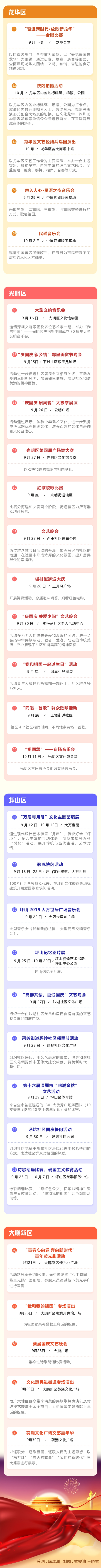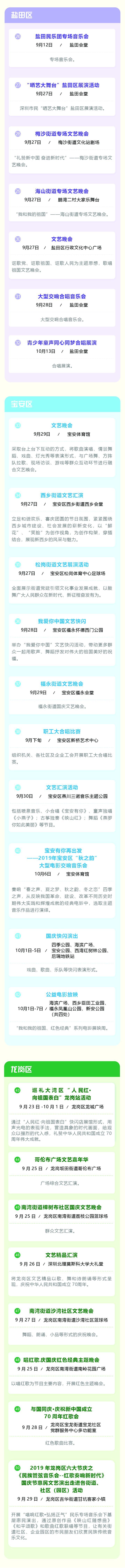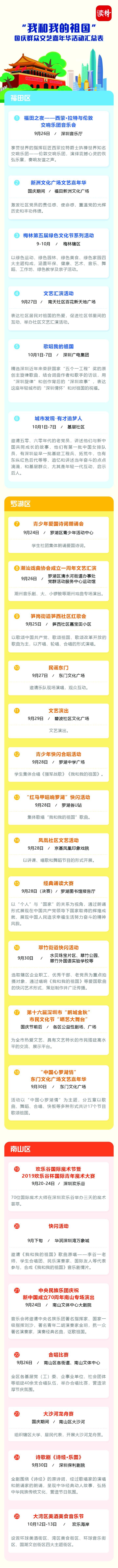 為慶祝中華人民共和國成立70周年,深圳市將舉辦專場音樂會(huì)、群眾文藝晚會(huì)、焰火晚會(huì)等活動(dòng),同時(shí)將舉行10場“愛我中華——南粵百園慶國慶”主題游園及80場“我和我的祖國”國慶群眾文藝嘉年華活動(dòng)。主題游園和文藝嘉年華活動(dòng)安排如下: