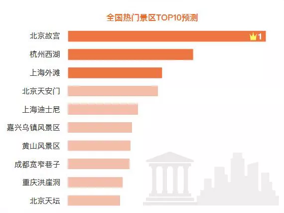 根據(jù)交通運(yùn)輸部科學(xué)研究院報(bào)告顯示,國(guó)慶全國(guó)熱門(mén)景區(qū)TOP10北京故宮、杭州西湖、上海外灘位列前三位,另外還有北京天安門(mén)、上海迪士尼、嘉興烏鎮(zhèn)風(fēng)景區(qū)、黃山風(fēng)景區(qū)、成都寬窄巷子、重慶洪崖洞、北京天壇位列其中。