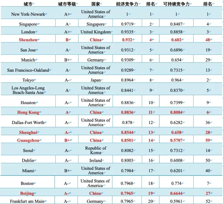 全球城市經濟競爭力指數(shù)前二十強