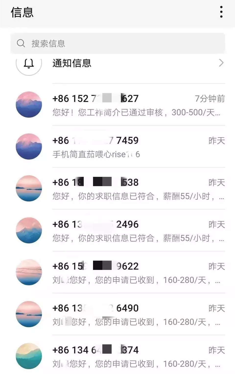 各種招聘電話以幾分鐘一個(gè)的頻率不斷打進(jìn)來。其中不少號(hào)碼一再被提示為高風(fēng)險(xiǎn)號(hào)碼。
