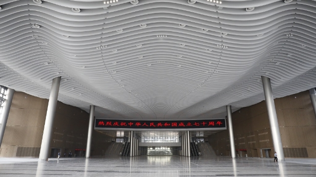 中央廊道和展廳之上,則是擁有超高顏值、可覆蓋106個(gè)標(biāo)準(zhǔn)足球場的金屬屋頂。如何讓平淡無奇的屋頂變得漂亮?設(shè)計(jì)方介紹,團(tuán)隊(duì)曾經(jīng)嘗試過云海、絲帶、花瓣等多種元素,經(jīng)過多次討論最終確定以海浪為原型,屋面呈現(xiàn)彩色絲帶花紋,寓意“海上絲綢之路”。屋頂?shù)氖┕ね瑯泳媲缶?,在施工過程中,工人通過航拍圖對比效果圖,錯(cuò)了一塊裝飾板都要更換。